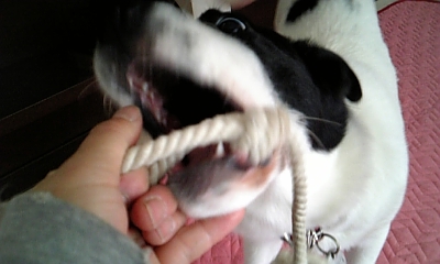 ちょっと遅いお昼をあげてからロープで遊びました。