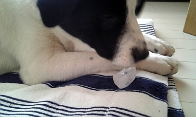 朝の散歩の後どうにもこうにもハァーハァーしてるので氷を1つあげました。